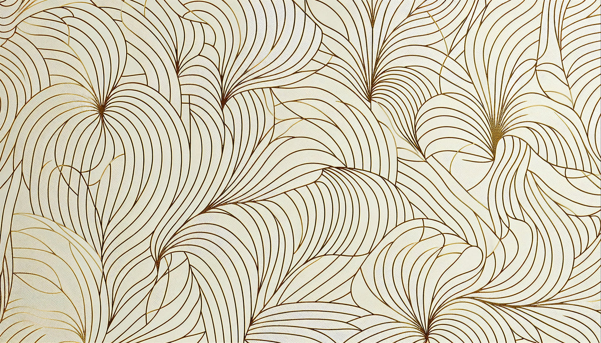 Du premier motif au dernier, vous y trouverez : lignes courbes vagues or fond crème minimaliste, ginkgo feuilles multicolores vagues fluides or, vagues abstraites bleu vert sauge. Chaque design est proposé en format panoramique, imprimé aux dimensions exactes de votre mur — sans découpe ni raccord approximatif.