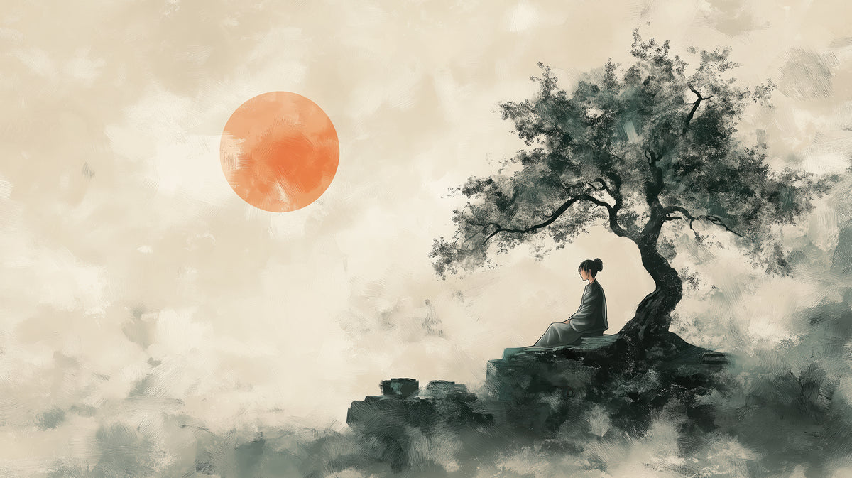 Du premier motif au dernier, vous y trouverez : montagnes brume soleil rouge barque encre chinoise, montagnes brumeuses encre noire, montagnes lac barque encre grise minimaliste. Chaque design est proposé en format panoramique, imprimé aux dimensions exactes de votre mur — sans découpe ni raccord approximatif.