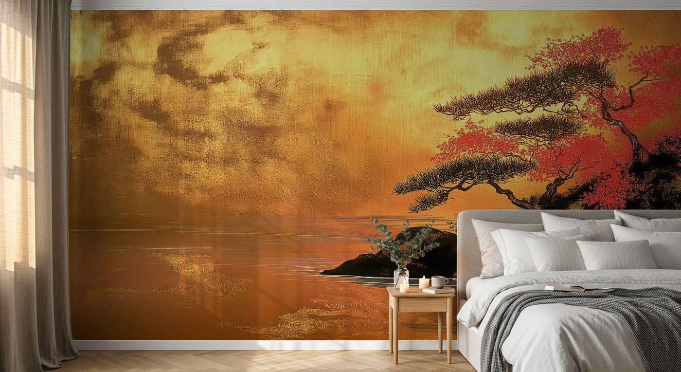 Du premier motif au dernier, vous y trouverez : bonsai cerisier rouge fond or, cerisier rouge calligraphie chinoise, cerisier rouge calligraphie chinoise. Chaque design est proposé en format panoramique, imprimé aux dimensions exactes de votre mur — sans découpe ni raccord approximatif.