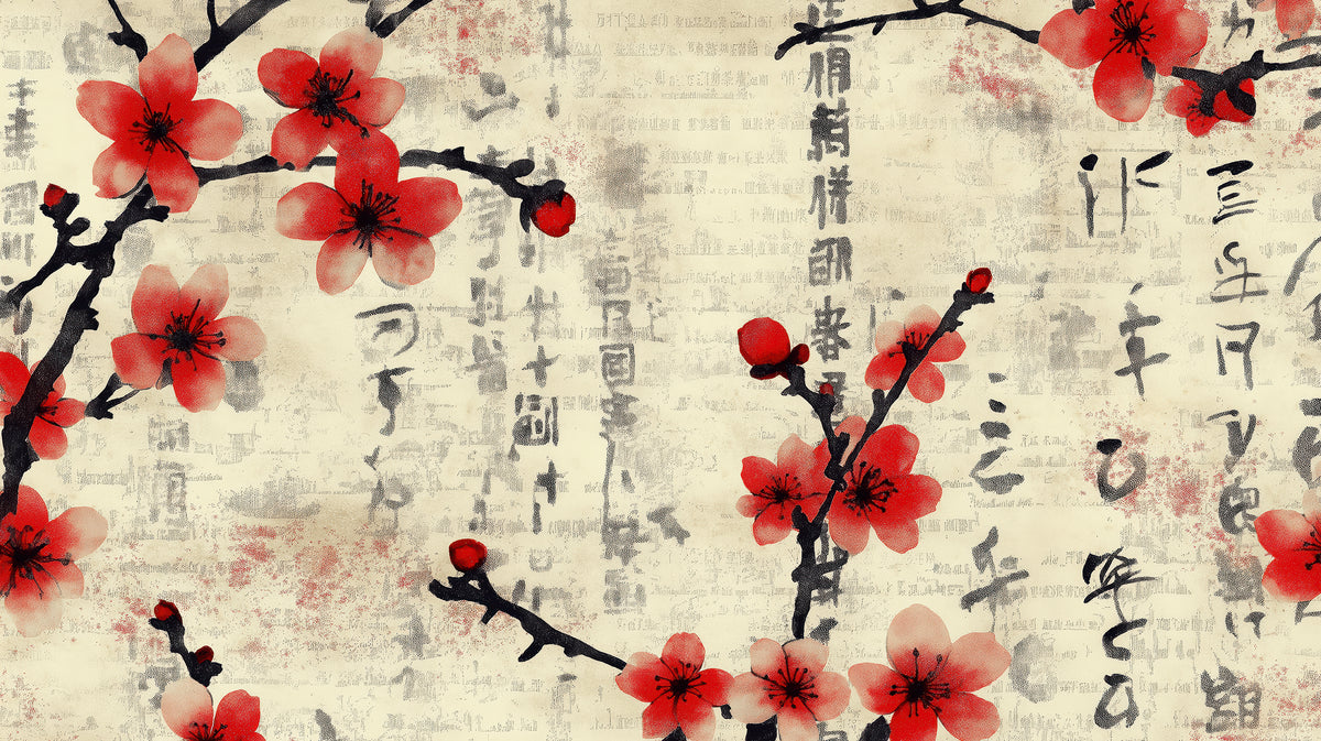 Design Papier peint Cerisier Rouge Encre Asiatique - Sur mesure