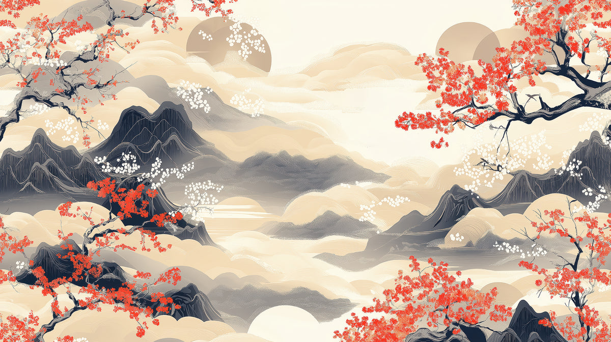 Du premier motif au dernier, vous y trouverez : bonsai cerisier rouge fond or, cerisier rouge calligraphie chinoise, cerisier rouge calligraphie chinoise. Chaque design est proposé en format panoramique, imprimé aux dimensions exactes de votre mur — sans découpe ni raccord approximatif.