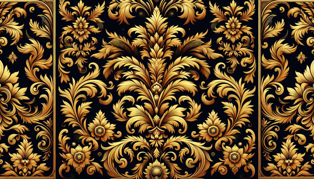 Du premier motif au dernier, vous y trouverez : damassé or noir baroque luxe, boiseries louis xvi, damassé floral vintage beige vert. Chaque design est proposé en format panoramique, imprimé aux dimensions exactes de votre mur — sans découpe ni raccord approximatif.