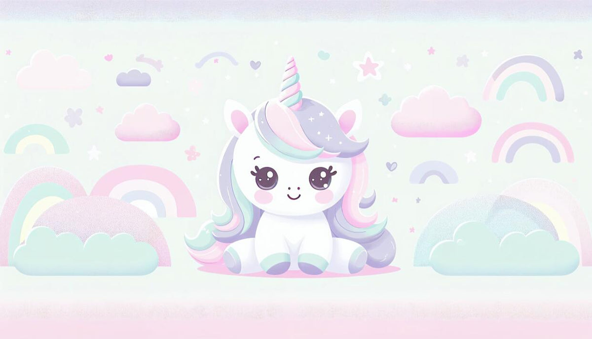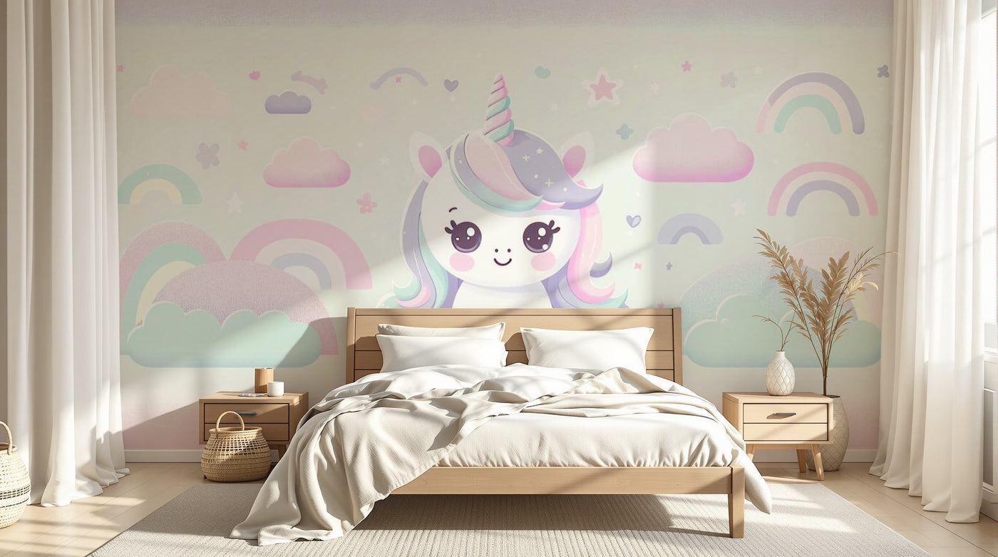 Papier peint licorne enfant, univers magique et coloré pour chambre fille. Illustrations douces. Sur mesure au m².