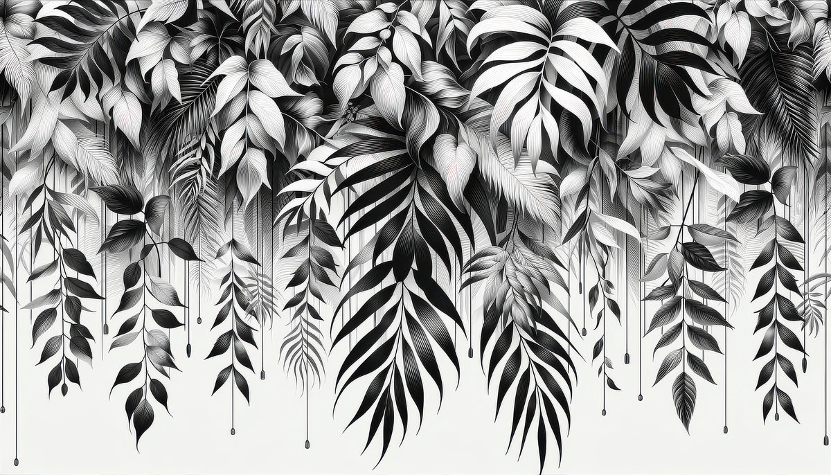 Du premier motif au dernier, vous y trouverez : feuilles tropicales line art noir blanc, noir blanc + dense photographique, palmes noires silhouette minimaliste. Chaque design est proposé en format panoramique, imprimé aux dimensions exactes de votre mur — sans découpe ni raccord approximatif.